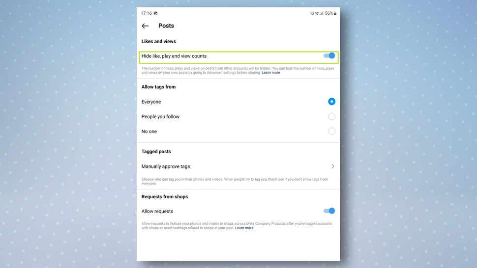 4. اضغط على زر التبديل بجوار إخفاء الإعجاب والتشغيل وعرض التهم لإخفاء إبداءات الإعجاب والمسرحيات عن الآخرين. للتراجع عن هذا ، ما عليك سوى النقر فوق زر التبديل مرة أخرى.