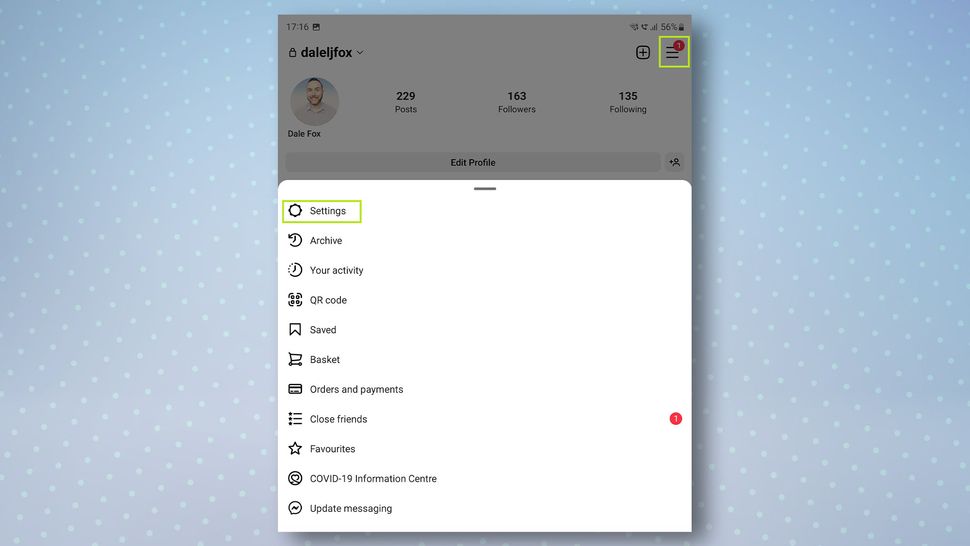 2. اضغط على الخطوط الثلاثة في الجزء العلوي الأيمن من ملف التعريف الخاص بك ، ثم انقر فوق “إعدادات”.